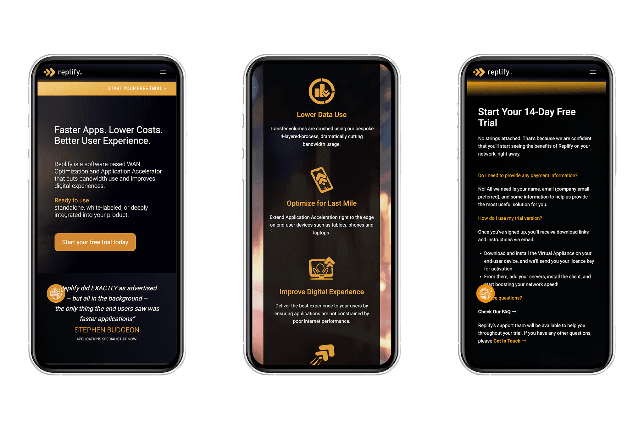Replify is a WAN (wide area network) optimization specialist that has been reducing bandwidth consumption and improving application performance for over 15 years. As more companies rely on cloud services and remote teams, Replify technology is more relevant than ever. That's why it was essential that their website and identity adapted in a modern tech landscape.