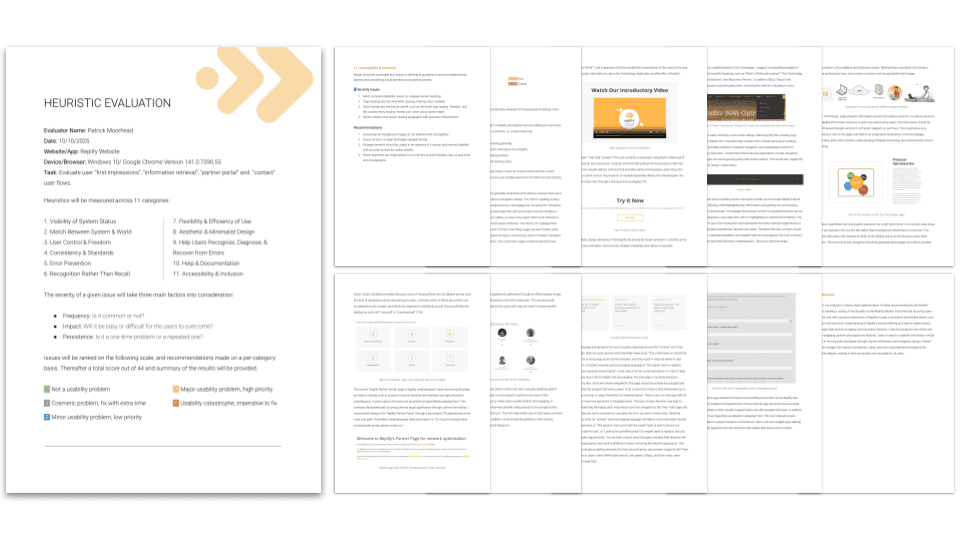 Website development started with a 28 page document to evaluate user “first impressions”, “information retrieval”, “partner portal” and “contact” user flows. We measured usability across 11 categories: